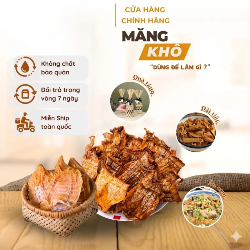 - Măng khô: Để măng khô không bị cứng, bạn nên ngâm nó trong nước khoảng 30 phút trước khi chế biến. Sau đó, bạn có thể xào với thịt hoặc nấu canh, măng sẽ mềm và thơm ngon hơn.