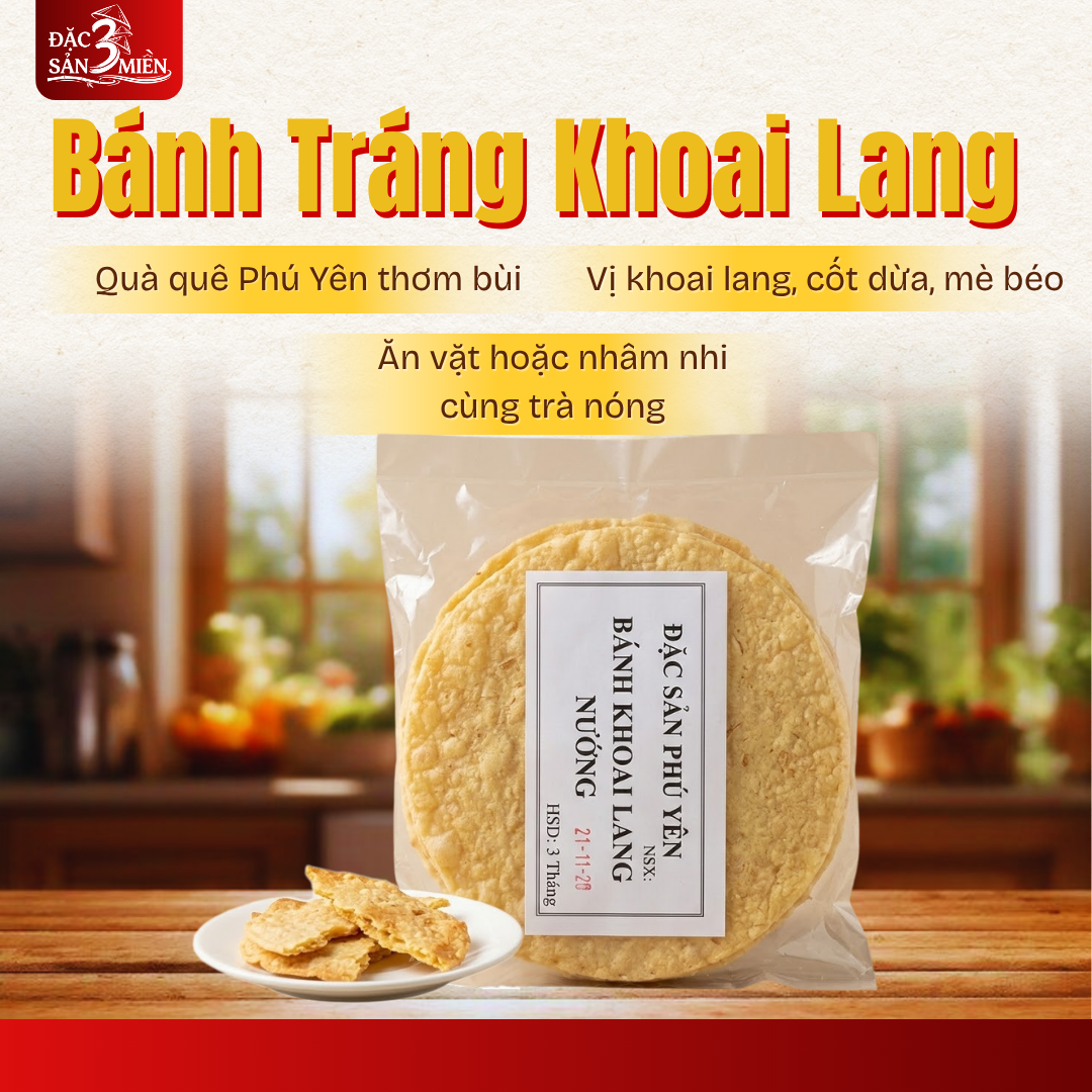 Bánh tráng khoai lang nướng là món quà quê thơm bùi, lớp bánh tráng vàng nhẹ, ăn béo dịu. Vị khoai lang quyện cùng cốt dừa và mè tạo cảm giác ngon miệng, hợp ăn vặt hoặc dùng kèm trà nóng. - Tên: Bánh khoai lang nướng.