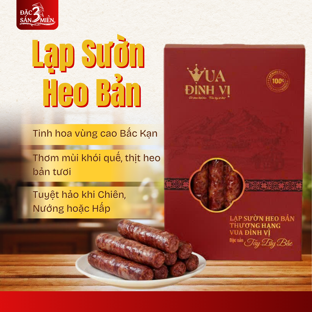 - Giới thiệu sản phẩm: Lạp sườn Bắc Kạn là món đặc sản truyền thống của người dân vùng cao, được làm từ thịt heo bản tươi ngon và tẩm ướp gia vị đặc trưng. Sau đó được hun khói bằng củi quế và bã mía, tạo nên hương vị thơm đậm đà, béo ngậy và rất đặc trưng của núi rừng.